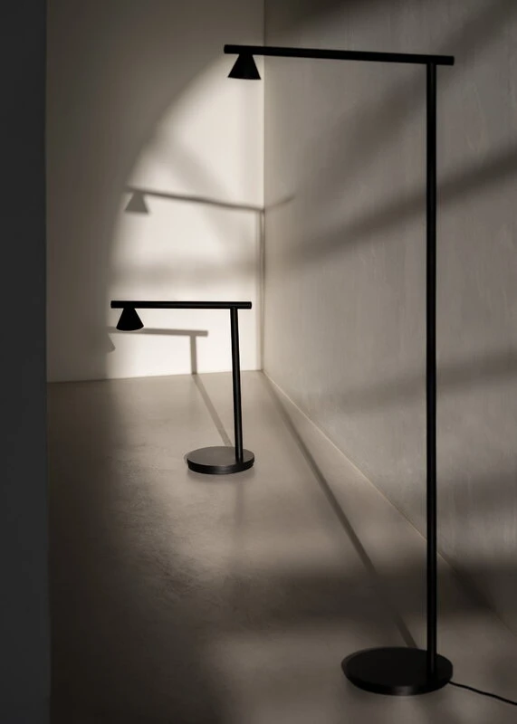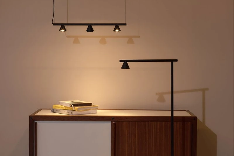 AGOn Probe-lattiavalaisin rakentuu mustasta, geometrisesta alumiinirungosta ja sen päähän kiinnitetystä kartionmuotoisesta varjostimesta, jonka spottivalo toimii erinomaisesti vaikkapa lukuvalona nojatuolin tai sängyn vieresssä.