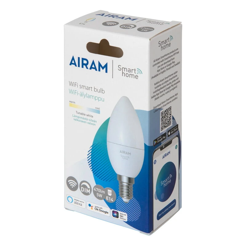 Airam SmartHome -kokoelmaan kuuluu wifi-verkkoon liitettäviä LED-älylamppuja useassa eri koossa ja kupuvaihtoehdossa. Älylamppujen käyttöönotto on tehty äärimmäisen helpoksi: itse lampun lisäksi tarvitset ainoastaan wifi-yhteyden (2,4 GHz) sekä puhelimeen ladattavan Airam SmartHome -sovelluksen, jonka avulla voit säätää valoa kulloiseenkin tunnelmaan, tilanteeseen ja vuorokaudenaikaan sopivaksi.