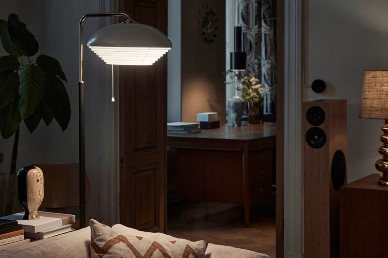 Artekin A811-lattiavalaisin on hallittu kokonaisuus eri värejä ja materiaaleja: valaisimen rungossa kohtaavat kiillotettu messinki ja musta nahka, ja sen näyttävä metallivarjostin koostuu kerroksittain asetetuista metallileveyistä, jotka hajottavat valon tasaisesti. Vuonna 1965 ilmestynyt A811-valaisin perustuu Alvar Aallon 1950-luvulla Helsingin Kansaneläkelaitokselle suunnittelemaan valaisinsarjaan, ja sen ajaton eleganssi löytää helposti paikkansa myös 2000-luvun kodeista ja julkisista tiloista.