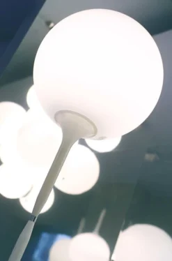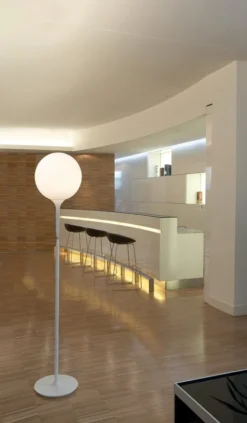 Artemiden Castore 35 -lattiavalaisin ihastuttaa pyöreänä hehkuvan varjostimen ja kauniisti kapenevan jalan liitolla. Varjostimen lisäksi valo pääsee kuultamaan myös varren läpi asteittain himmeten. Varjostin on valmistettu valkoisesta, puhalletusta lasista, varsi on ohutta muovia ja jalusta metalliseosta.