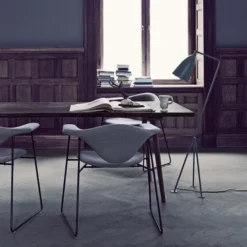 Greta Magnussonin suunnittelema Gräshoppa-lattiavalaisin ilmestyi markkinoille ensimmäisen kerran vuonna 1947, ja tanskalainen GUBI julkaisi sen uudelleen vuonna 2011. Heinäsirkan muodosta nimensä saaneen Gräshoppa-lattiavalaisimen vinot jalat ja takakenoinen asento antavat sille dynaamisen, persoonallisen ilmeen, ja käännettävän varjostimen ansiosta valon voi kohdistaa haluamaansa suuntaan. Siro, kolmijalkainen Gräshoppa-valaisin on valmistettu jauhemaalatusta teräksestä.