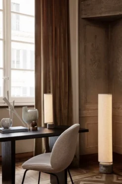 GUBIn Unbound-lattiavalaisin loihtii hienostuneen kodikasta tunnelmaa monenlaisiin sisustuksiin. Muotoilustudio Space Copenhagenin suunnitteleman Unbound-valaisinsarjan muotokieli on saanut vaikutteita japanilaisten lyhtyjen estetiikasta, mikä huokuu erityisesti läpikuultavasta, pellavaisesta varjostimesta. Vastapainoa ja kontrastia keveän kapeaan varjostimeen tuo valaisimen painava, pisaranmuotoinen alusta, joka on valmistettu tukevasta marmorista.