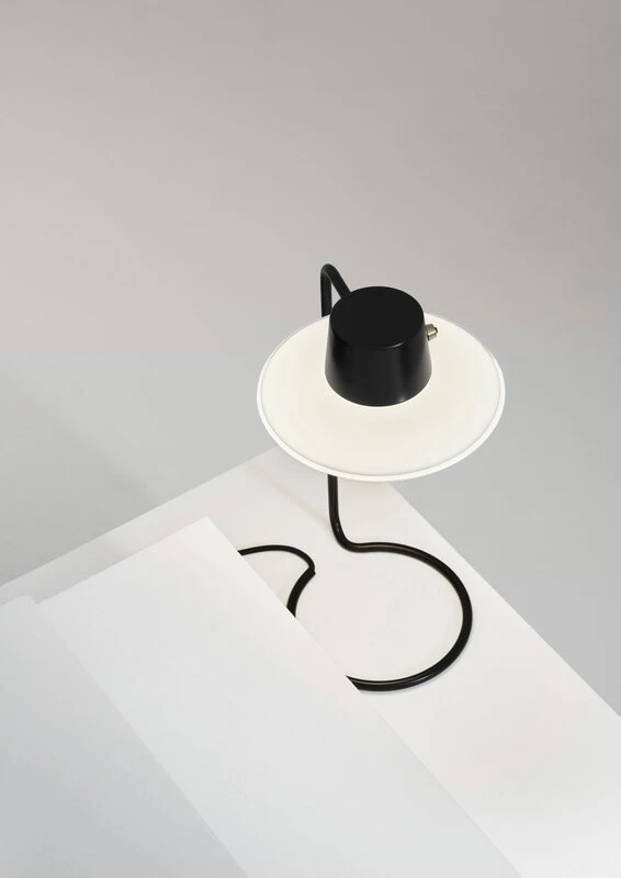Ilmeeltään AJ Oxford on selkeän graafinen ja minimalistinen, ja osan sen yksityiskohdista huomaakin vasta lähemmällä tarkastelulla. Tästä hyvä esimerkki on valaisimen johto, joka kulkee hienostuneesti valaisinvarren läpi. Mustan metallin ja valkoisen lasin lisäksi valaisimessa on myös hieman messinkiä, nimittäin varjostimen sormiruuvissa ja liitosmutterissa. Käsittelemätön materiaali saa ajan myötä ylleen kauniin patinan.