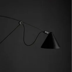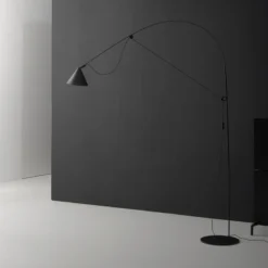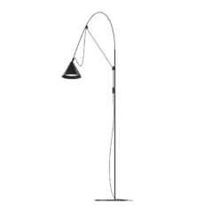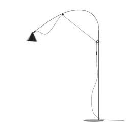 Stefan Diezin suunnittelema AYNO viehättää kekseliäisyydellään ja kauniin minimalistisella ulkonäöllään. Pelkistetty valaisin koostuu kartionmuotoisesta varjostimesta ja mustasta virtajohdosta, joka on kiinnitetty ohueen lasikuitutankoon kahdella säätörenkaalla. Valaisimen juju on sen riemastuttavan yksinkertaisessa mutta tehokkaassa ohjailtavuudessa: valon suuntaa ohjataan virtajohdossa olevia säätörenkaita liu’uttamalla. Kun renkaita siirtää, ne kiristävät sähkökaapelia, joka puolestaan taivuttaa lasikuitutangon tyylikkäälle graafiselle kaarelle. Tarvittaessa valon suuntaa voidaan hienosäätää vielä lisää varjostimen kupua kääntämällä.