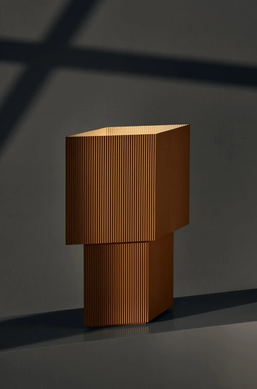 Pholcin Romb-pöytävalaisinta hallitsee vahvan geometrinen muotokieli, joka kiinnittää katseen tilassa kuin tilassa. Valaisin on kuitenkin paljon enemmän kuin mitä ensi vilkaisulla saattaa näyttää: sen pintaa raidoittaa herkkä, kevyesti aaltoileva tekstuuri, joka luo kiinnostavaa kontrastia täsmälliselle muodolle. Suunnittelijat Mats Broberg ja Johan Ridderstråle ovat kertoneet saaneensa pintakuvioon idean aaltopahvista, jota he käyttävät usein suunnittelunsa apuna arkkitehtuuripienoismalleissa.