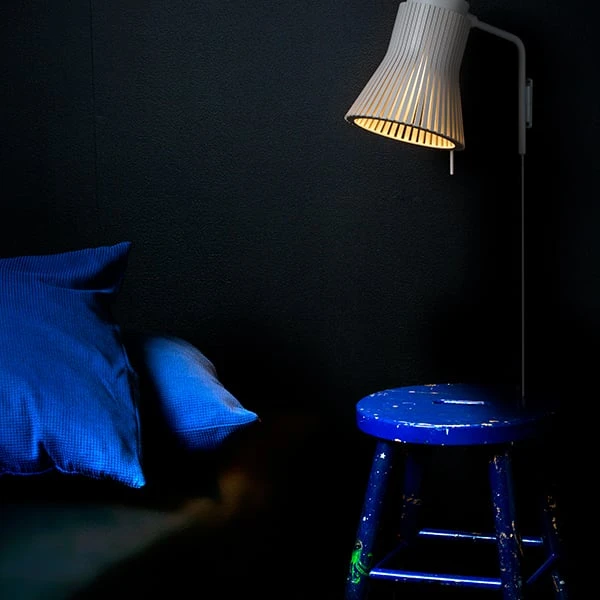 Secto Designin Petite 4630 -seinävalaisin hurmaa siron jalan päähän asetetulla puisella varjostimella, jonka lävitse valo pääsee kuultamaan tunnelmallisesti.